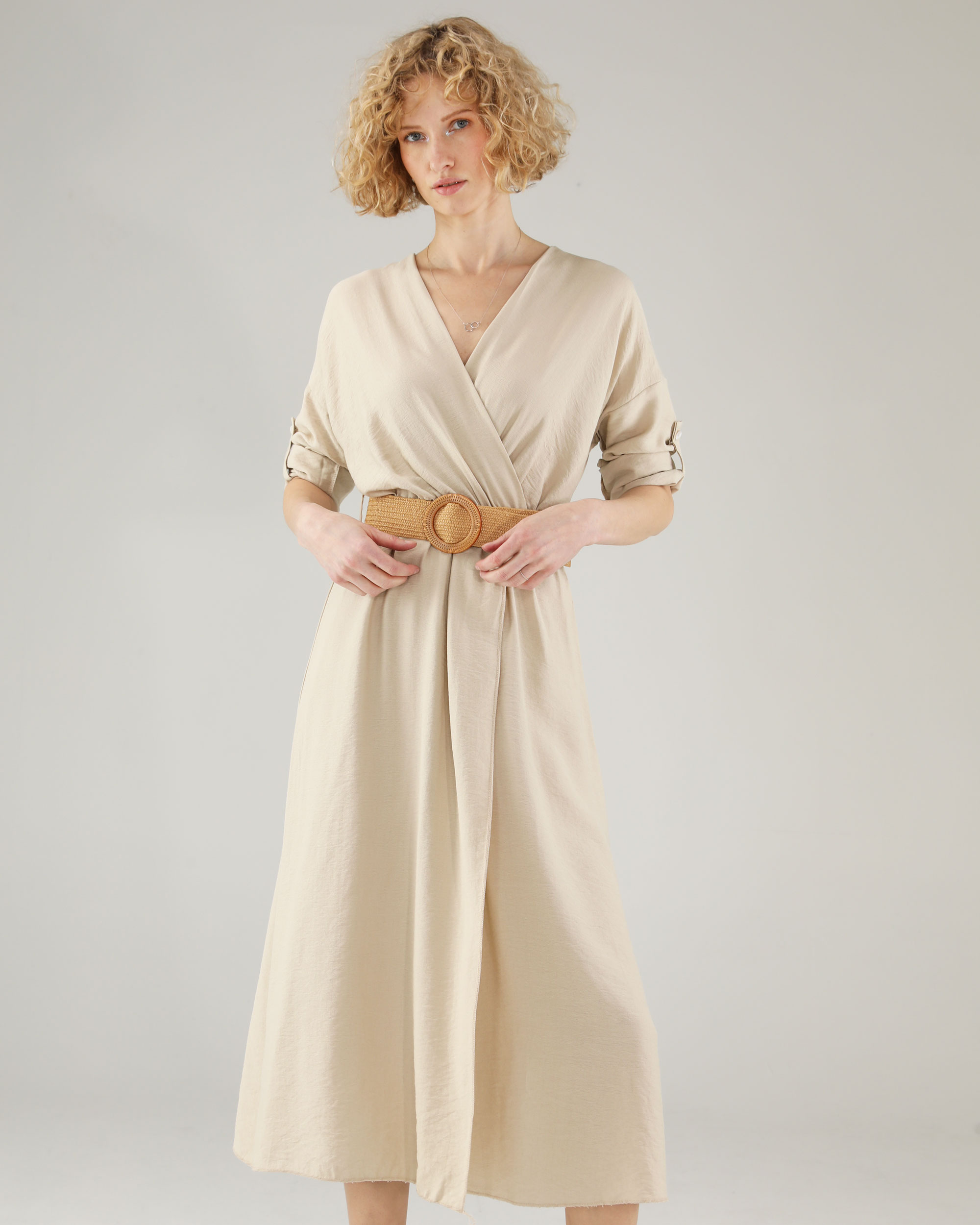 Beżowa sukienka z paskiem