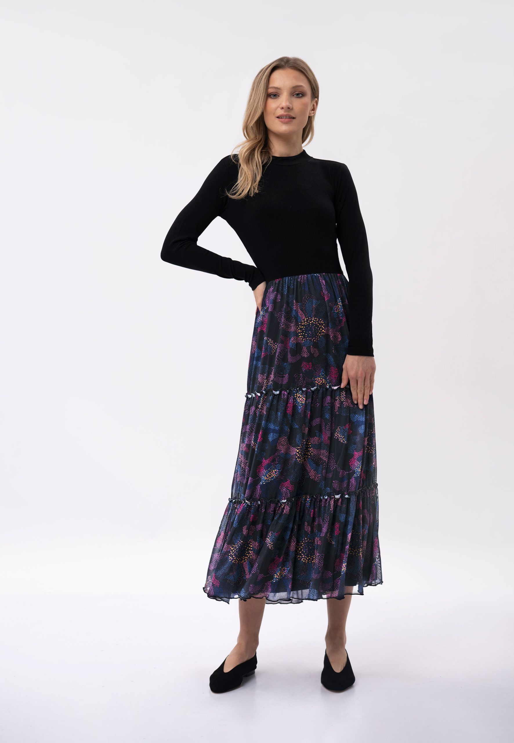 • Czarna, zwiewna sukienka maksi Sukienka maxi wyróżnia się czarną górą i kolorowym, ale stonowanym dołem