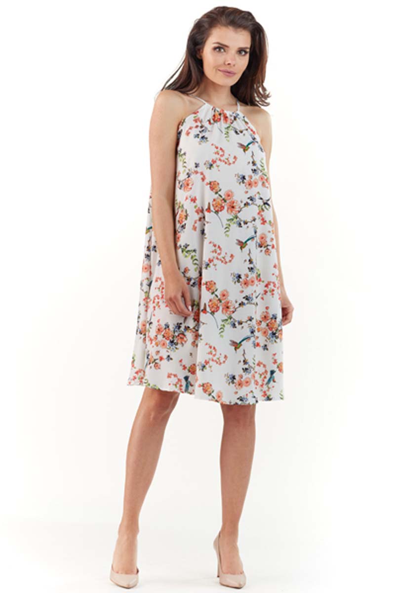 Podoba Ci się Ecru Zwiewna Sukienka Mini w Kwiatowy Wzór z Wiązanym Dekoltem?