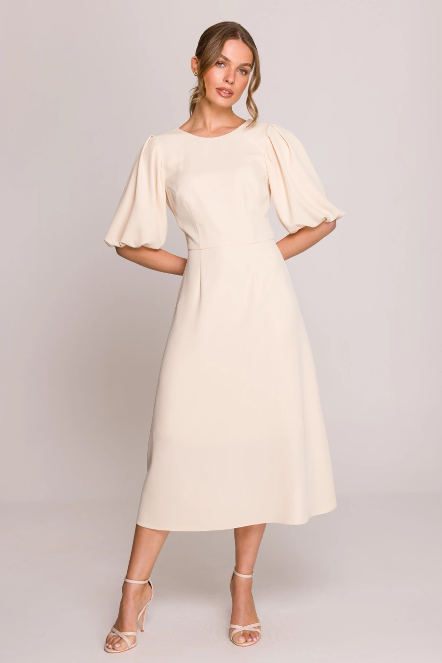 Elegancka sukienka koktajlowa z bufiastymi rękawami kremowa