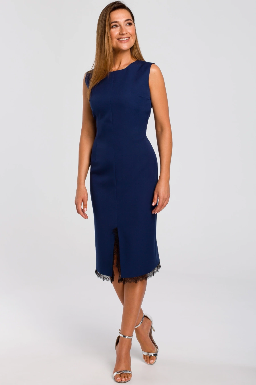 • Klasyczna i stylowa sukienka bez rękawów z subtelnym akcentem, który przykuwa uwagę ku dołowi – rozcięciem z przodu na dole wykończonym piękną koronką