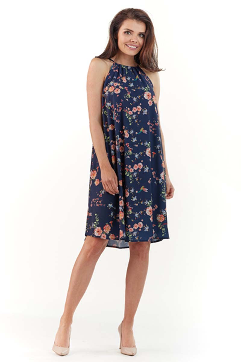 Podoba Ci się Granatowa Zwiewna Sukienka Mini w Kwiatowy Wzór z Wiązanym Dekoltem?