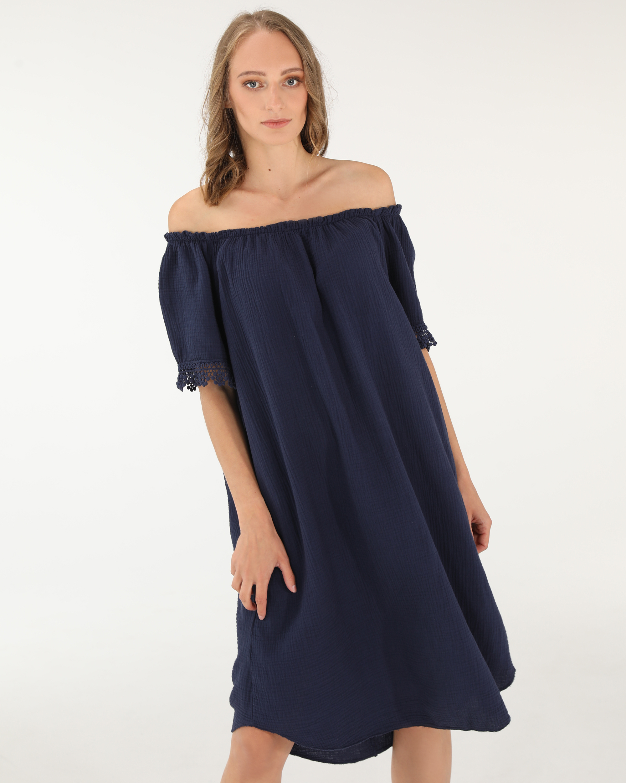 • Granatowa sukienka wykonana z miękkiej tkaniny w 100% z bawełny