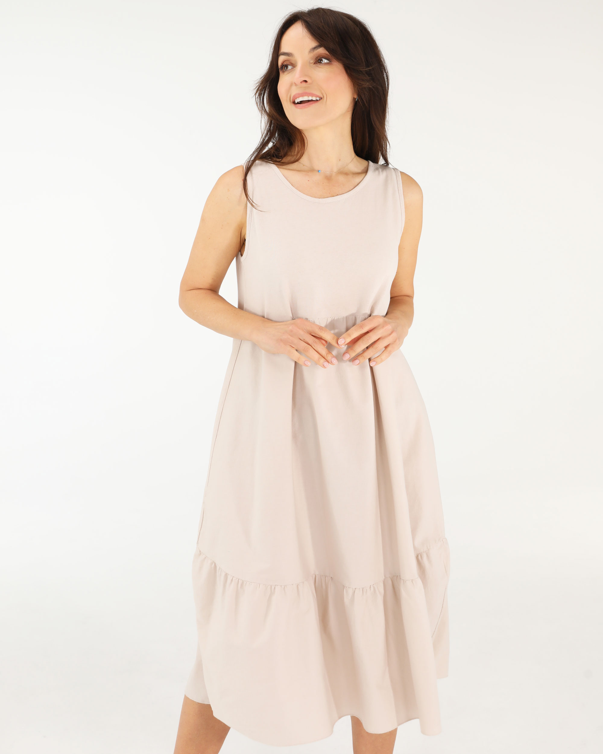 • Beżowa sukienka wykonana z cienkiej i miękkiej bawełny