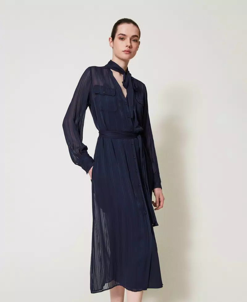 • Koszulowa sukienka midi z dekoltem w serek i wiązaniem pod szyją, uszyta z tkaniny georgette z satynowymi paskami o głębokim granatowym kolorze