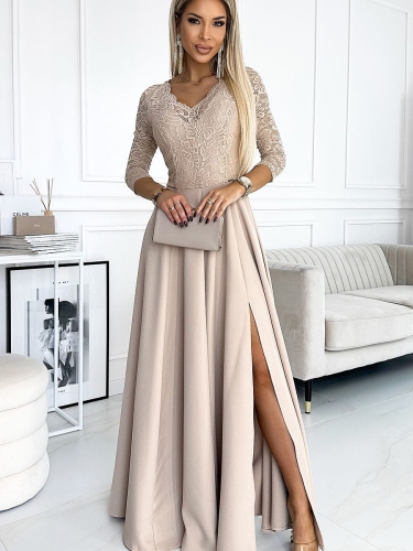 • Pięknie wyprofilowany dekolt i rozcięcie na spódnicy tworzy niecodzienną kreację w kolorze beżowym