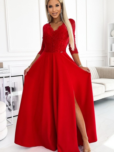 • Pięknie wyprofilowany dekolt i rozcięcie na spódnicy tworzy niecodzienną kreację w kolorze czerwonym