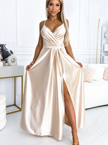• Elegancka maxi długa satynowa suknia z rozcięciem na nogę i paskiem