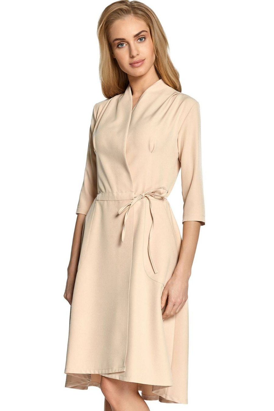 Sukienka trapezowa kopertowa midi z paskiem i kieszeniami beżowa