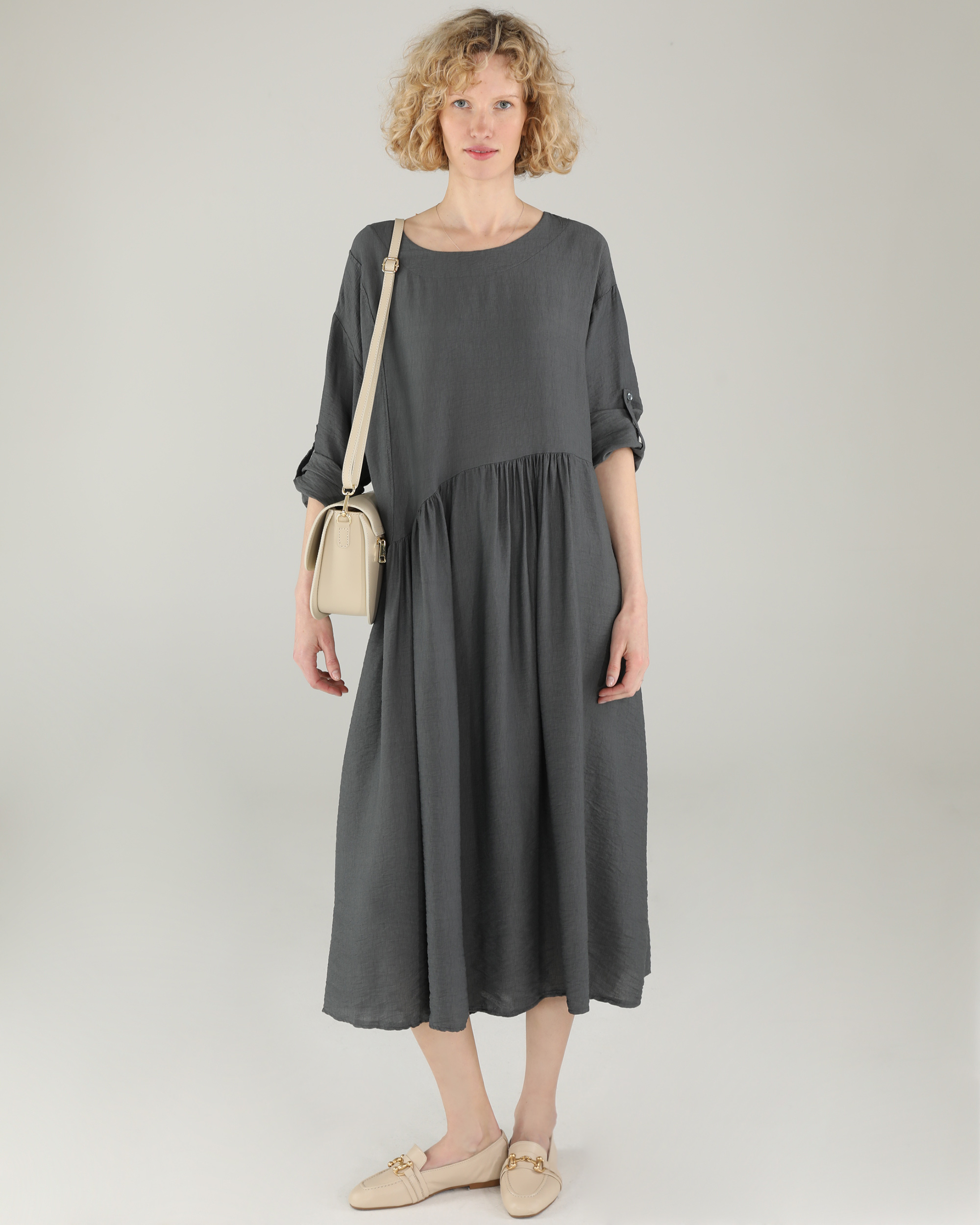 Szara sukienka z wiskozy, cechy i zalety.